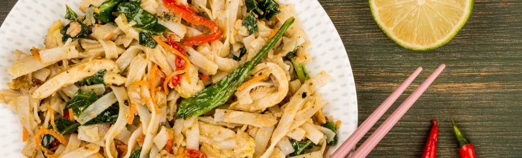 Traditional thai noodles cooked homemade sauce, bean sprouts and crushed peanut.